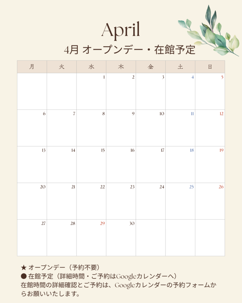 ご来館のお申し込みは、Googleカレンダーの予約フォームからお願いいたします。