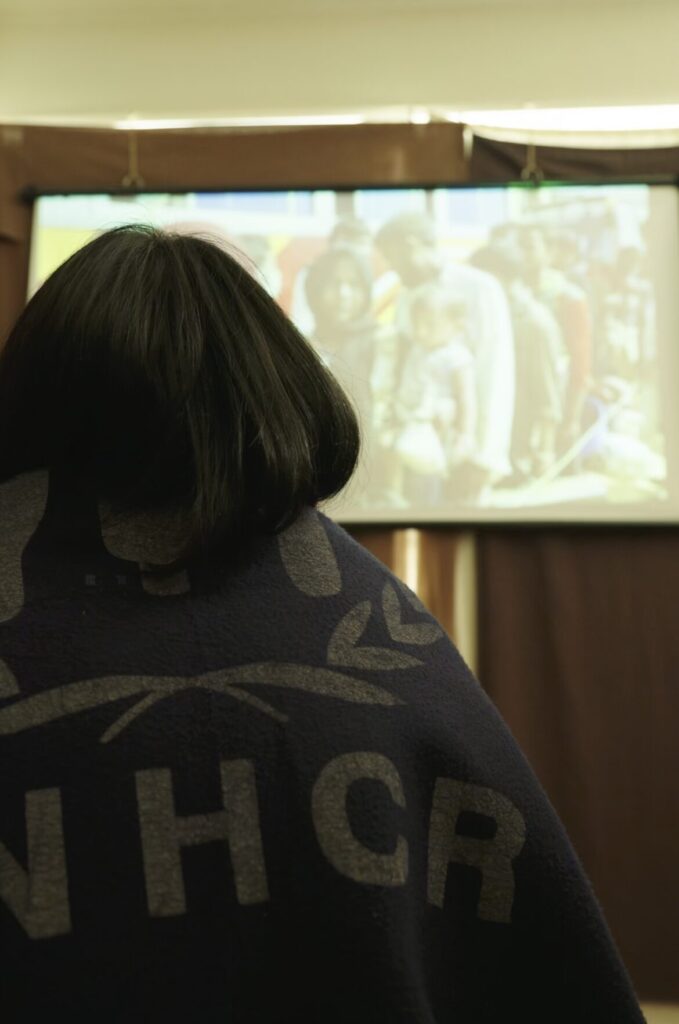 A 難民の声をもとにした、8分43秒の映像作品を鑑賞できます。難民キャンプで実際に配られている毛布に触れたり、くるまったりしながら観る、静かで個人的な体験型の展示です。