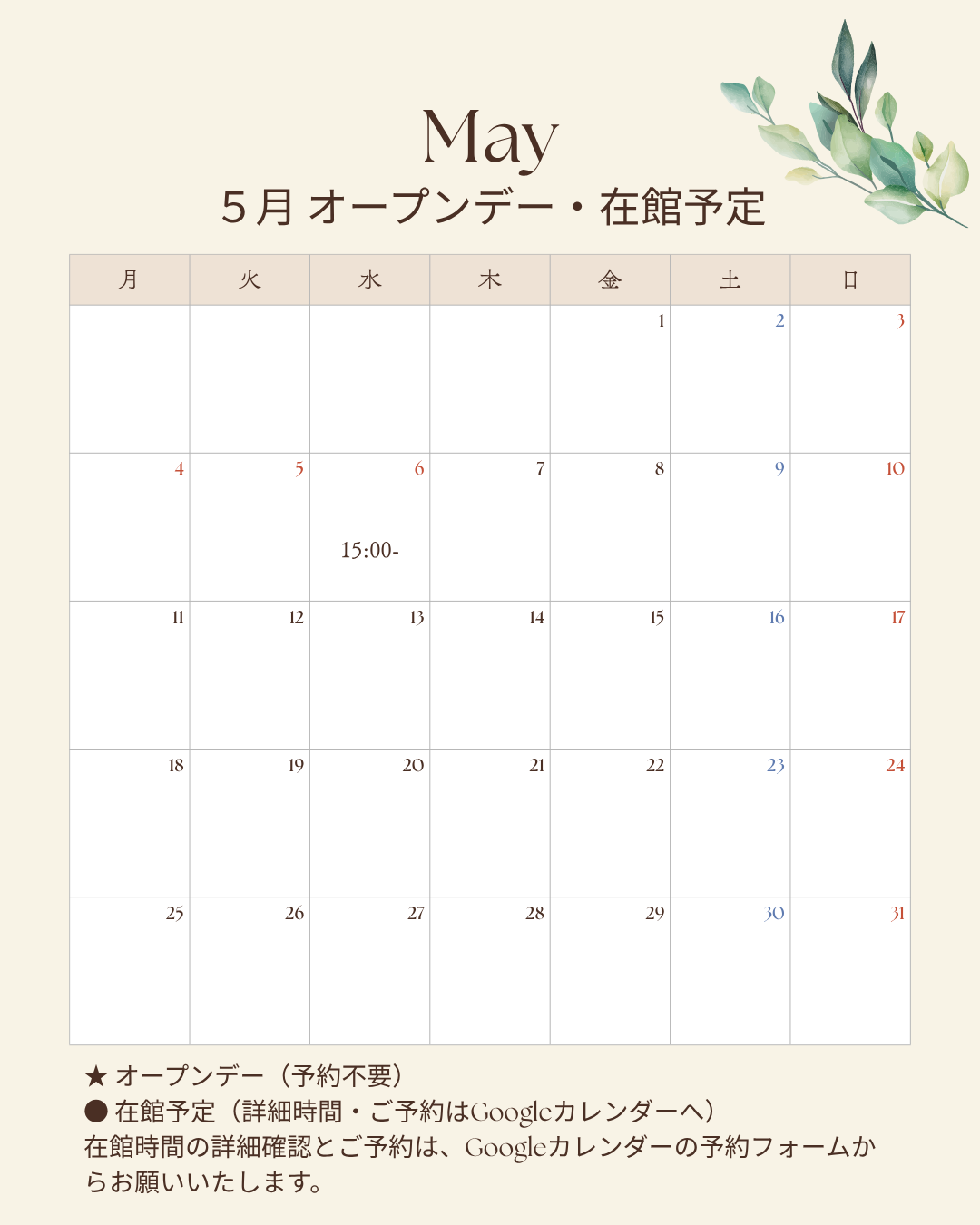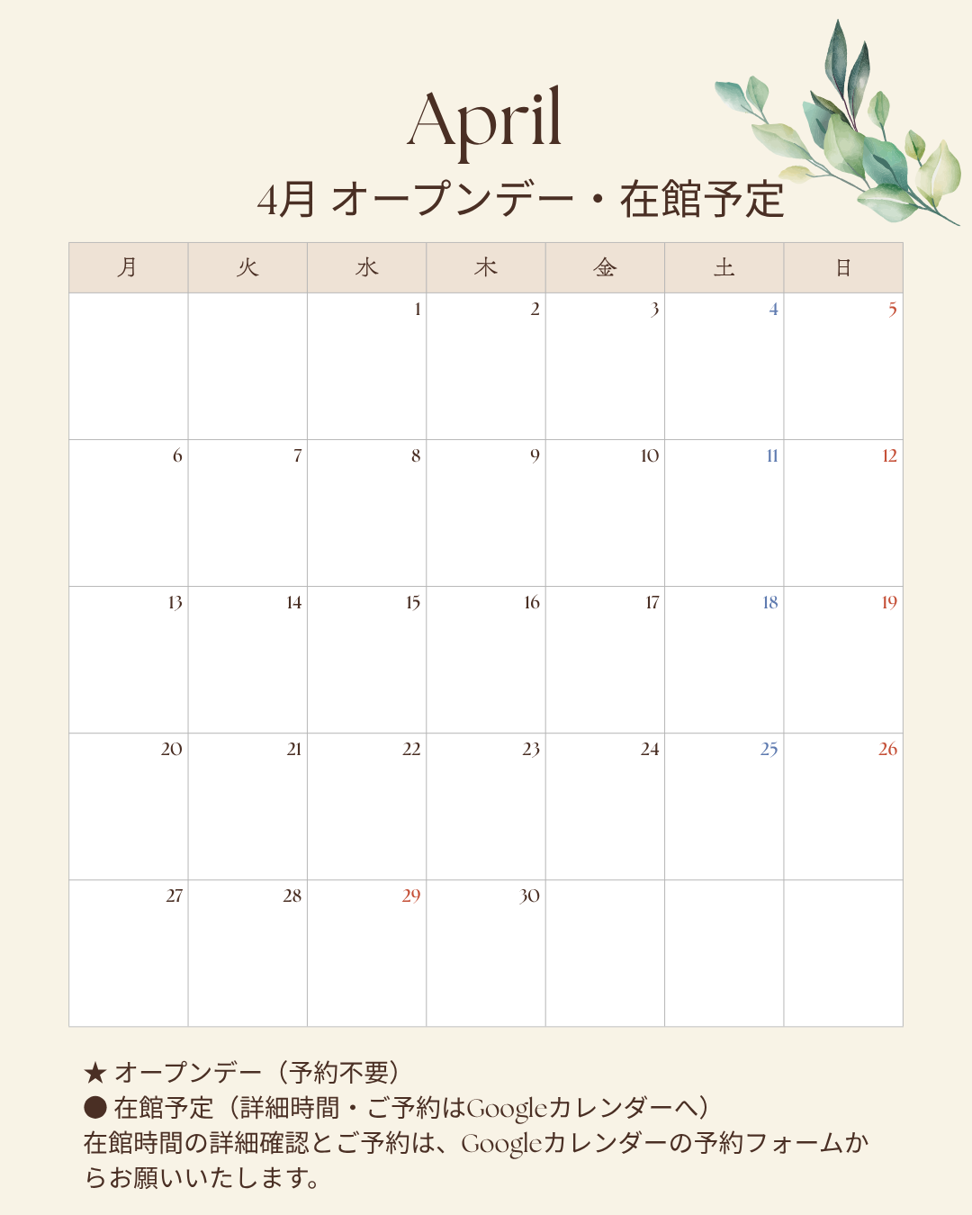 ご来館のお申し込みは、Googleカレンダーの予約フォームからお願いいたします。