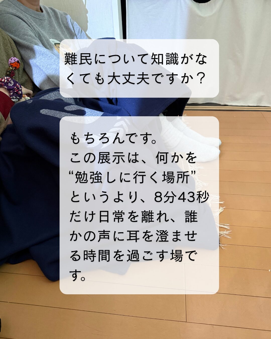 A 難民の声をもとにした、8分43秒の映像作品を鑑賞できます。難民キャンプで実際に配られている毛布に触れたり、くるまったりしながら観る、静かで個人的な体験型の展示です。